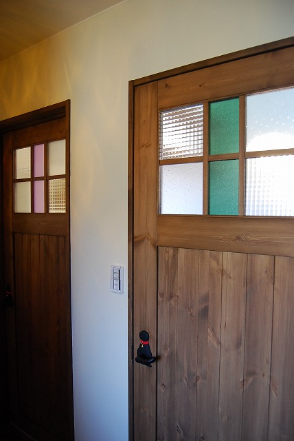 最近はチェッカーガラスなどを使って 個性的なドアもあります。