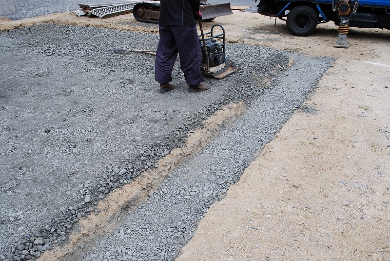 掘り込んだ地面にクラッシャーを敷き 隅々まで何度も何度も転圧。